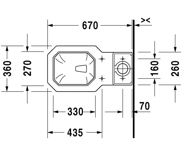 (无水箱), 加长型带虹吸喷头, 美式座便器, 305 mm/12" 坑距, 水平出水, 1.28加仑/冲 (4.8升) Duravit 设计 尺寸 360 x 665 mm 可变形式 © 2130010000