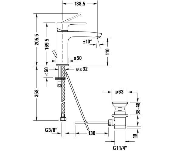 陶瓷混合系统, 伸出长度 139 mm, 连接软管 3/8", 起泡器可调节, 标准喷雾, 表面镀铬, 温度范围可调节, 推荐在压力 3-5 bar下进行操作, 带下水器套装, 170 mm