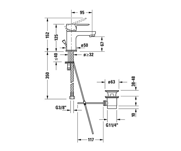 单把手面盆龙头 陶瓷混合系统, 伸出长度 95 mm, 连接软管 3/8", 标准喷雾, 表面镀铬, 温度范围可调节, 推荐在压力 3-5 bar下进行操作, 带下水器套装, 125 mm,可变形式 流量率 5,6 升/分钟(3个) A11010001010