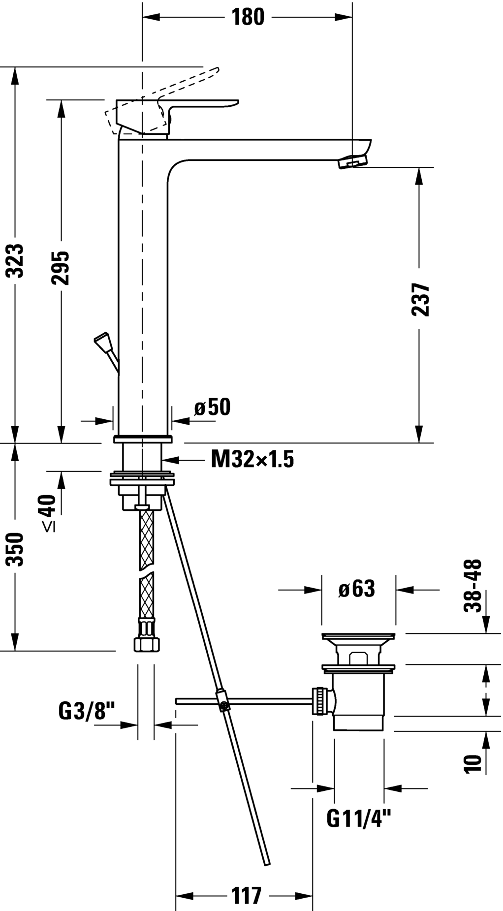 陶瓷混合系统, 伸出长度 180 mm, 连接软管 3/8", 标准喷雾, 表面镀铬, 温度范围可调节, 推荐在压力 3-5 bar下进行操作, 带下水器套装, 295 mm