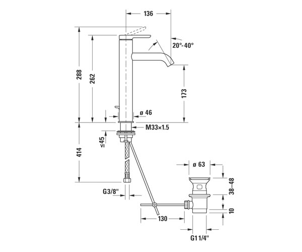 陶瓷混合系统, 伸出长度 136 mm, 连接软管 3/8", 起泡器可调节, 标准喷雾, 推荐在压力 3-5 bar下进行操作, 带下水器套装, 262 mm